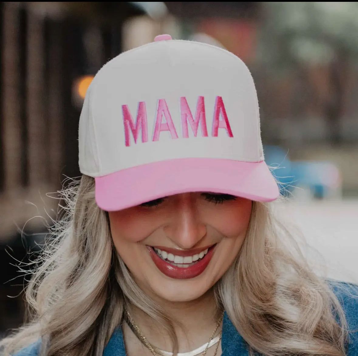 Featuring bold "MAMA" embroidery and a pop of color on the brim, this cute trucker hat screams trendy mom vibes.